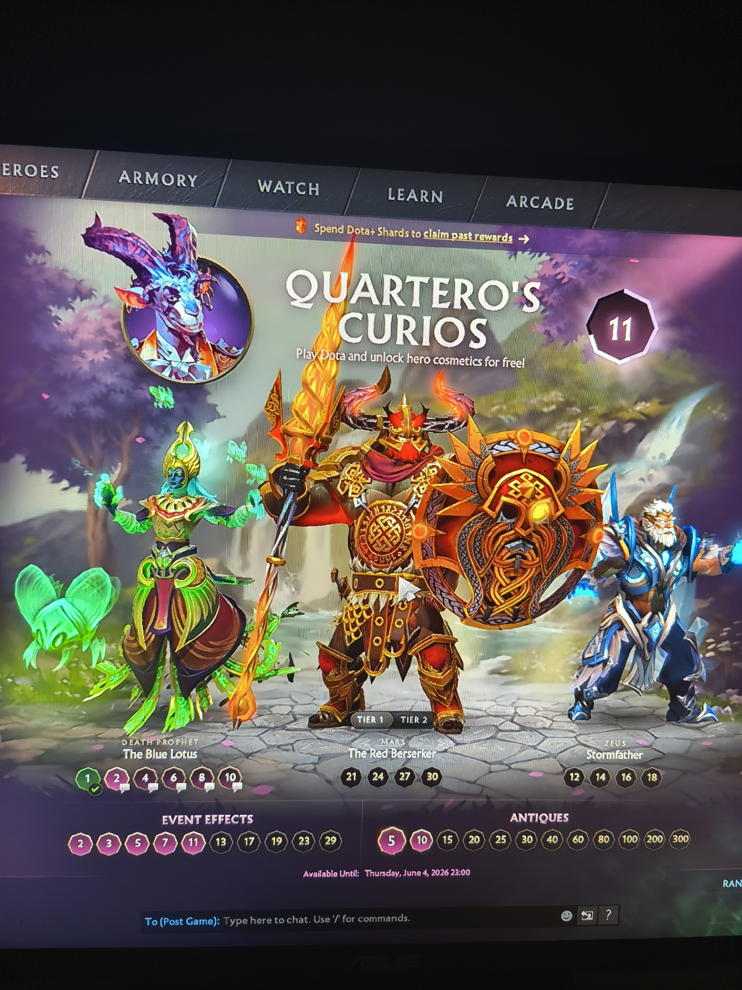 A photograph captures a computer monitor displaying a video game interface. The screen exhibits minor glare and a visible black border from the surrounding monitor bezel. The digital content on the screen is a menu titled "QUARTERO'S CURIOS," presented in a stylized font with a fiery visual effect. Below the title, the text reads: "Play Dota and unlock hero cosmetics for free!" A purple octagonal badge on the right side of the screen displays the number "11." The background of this section depicts a stylized fantasy landscape with muted purples and greens, featuring trees, a waterfall, and a foreground of stone-tiled ground. Three distinct character models are prominently displayed on the stone-tiled ground: 1. **Left:** A slender, humanoid figure identified as "DEATH PROPHET The Blue Lotus." This character has teal skin, an ornate green and gold headpiece, and flowing green and red robes. Its hands are raised, emitting a green glow surrounded by small green butterfly-like effects. A larger green winged creature is near its left foot. Below the character, a green circle with a checkmark is present next to the number "1," followed by unselected purple octagons labeled "2, 4, 6, 8, 10." 2. **Center:** A muscular, heavily armored humanoid figure identified as "MARS The Red Berserker." This figure wears a red face mask, a horned helmet, and intricate red, gold, and brown armor. It holds a flaming gold spear in its right hand and a large, round, ornate red and gold shield with a skull-like design in its left. Below the character, the labels "TIER 1" and "TIER 2" are visible, alongside unselected purple octagons labeled "21, 24, 27, 30." 3. **Right:** An older, muscular male figure identified as "ZEUS Stormfather." This character features white hair and a beard, wearing blue, white, and gold armor. Blue electrical energy emanates from its hands and body. Below the character, unselected purple octagons are labeled "12, 14, 16, 18." Above the main content area, a navigation bar displays the options "HEROES," "ARMORY," "WATCH," "LEARN," and "ARCADE." An orange gem icon accompanies the text "Spend Dota+ Shards to claim past rewards." At the bottom of the screen, two rows of progress indicators are visible: - "EVENT EFFECTS" displays a row of purple octagons labeled "2, 3, 5, 7, 11, 13, 17, 19, 23, 29." - "ANTIQUES" displays a row of purple octagons labeled "5, 10, 15, 20, 25, 30, 40, 60, 80, 100, 200, 300." A timer indicates "Available Until: Thursday, June 4, 2026 23:00." A chat input field is present, stating "To (Post Game): Type here to chat. Use '/' for commands," accompanied by icons for emote, reply, and help. A partially visible "RANK" button is located on the far right. The image itself does not depict a physical location in a city but rather a digital interface displayed on a screen.