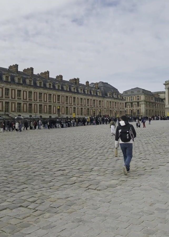 large cobblestone courtyard surrounded by buildings, with many people walking around. The buildings are grand and ornate, with the one at the center having a golden gate. The sky is cloudy and overcast. People are dressed in casual clothing. Some people are walking alone, while others are in groups. The people in the video are moving from left to right in the frame. There is a long line of people on the left side of the frame.