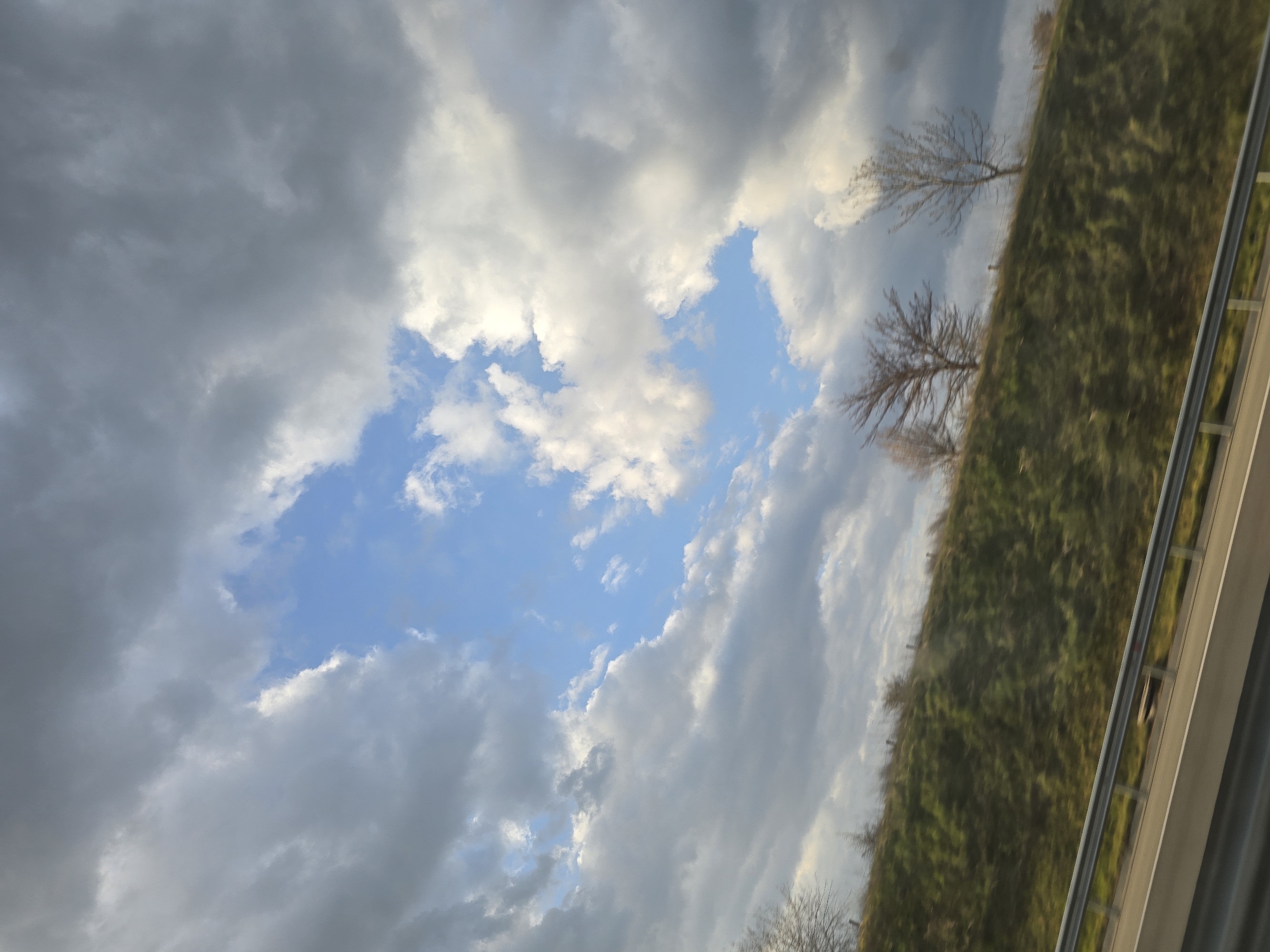The image displays a landscape captured from a moving vehicle, exhibiting an upward-angled view. The upper half of the frame is dominated by a dynamic sky featuring a mix of dark grey and white cumulus clouds, with a prominent irregular opening of clear blue sky visible in the upper-middle portion, interspersed with smaller white clouds. The lower half of the image depicts a sloping green hillside covered with sparse, short vegetation, suggesting an early spring or late autumn season. Several bare deciduous trees are positioned on the hillside; at least three distinct trees are visible, one partially cropped on the far left, another in the center-right, and a third on the far right. No foliage is discernible on these trees. A faint, dark horizontal line, possibly a fence or a wire, is visible along the upper edge of the hillside. In the foreground, a multi-lane asphalt road or highway is partially visible on the bottom left. A silver-colored metallic guardrail runs horizontally across the lower part of the image, separating the road from the hillside. The immediate foreground below the guardrail is dark, likely representing the vehicle's interior or the obscured lower part of the road. No individuals, specific actions, or interactions are observable. The scene is described as being in Yazdach, Bulgaria. The depicted landscape is consistent with rural or exurban environments found in parts of southeastern Europe. However, "Yazdach" is not a recognized major city or town in Bulgaria, and no specific geographical markers identifying this precise location are visible within the image.