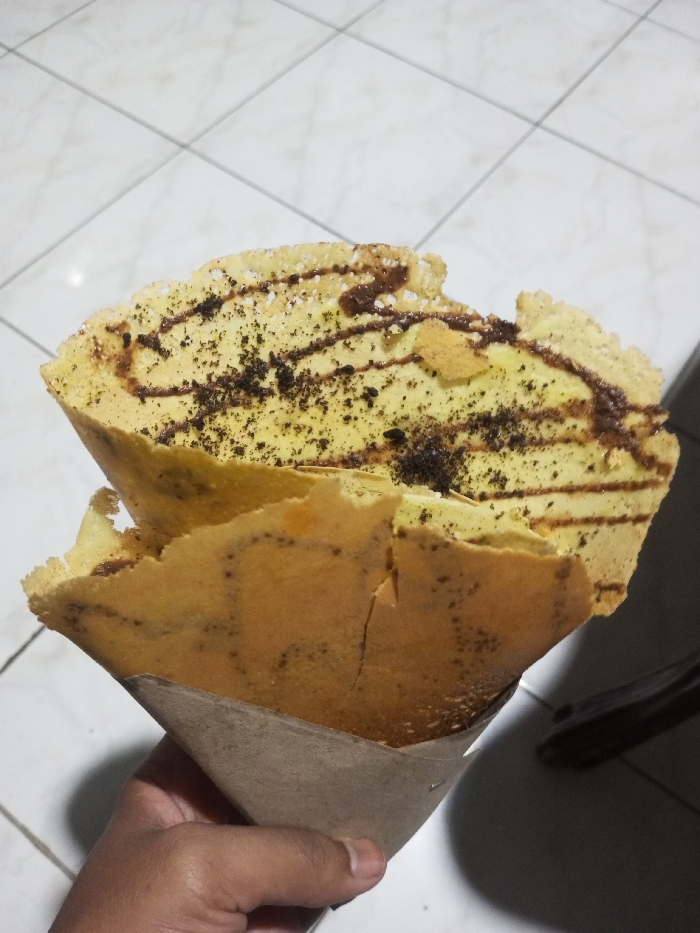 The specific city of Pandaria, India, is not discernable from the visual information provided. The scene depicts a close-up of a human hand holding a dessert resembling a folded, thick pancake or crepe. The dessert has a light brown exterior and a lighter, yellowish interior. Visible toppings on the interior include irregular drizzles of dark brown chocolate syrup, scattered dark granular particles (consistent with crushed cookies or chocolate pieces), and sparse white powder, possibly powdered sugar. The top edge of the dessert appears somewhat irregular with minor tearing. The lower portion of the dessert is encased in a plain, light brown paper wrapper, held by a hand with medium-dark skin tone. The background consists of a light-colored, possibly white, tiled floor with dark grout lines, indicating an indoor or covered outdoor setting. No other subjects or interactions are present.