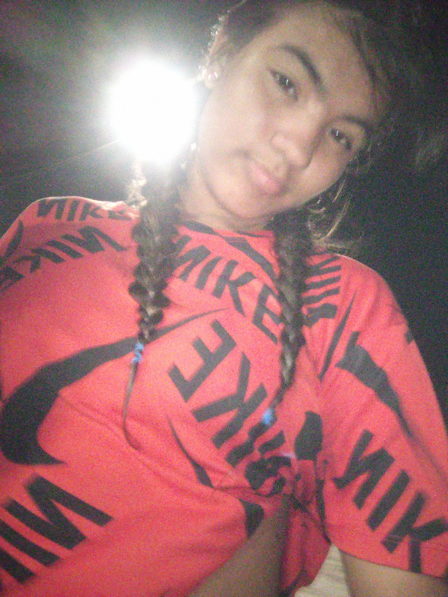 A medium-shot, high-angle photograph depicts a person with braided hair, wearing a red shirt with black "NIKE" text repeating in a chaotic pattern. The lighting is poor, with a bright, indistinct light source overexposing the upper-left area of the frame. The person looks directly at the camera, with a slight smile. The background is dark and indistinct. The location is not discernible from the image.
