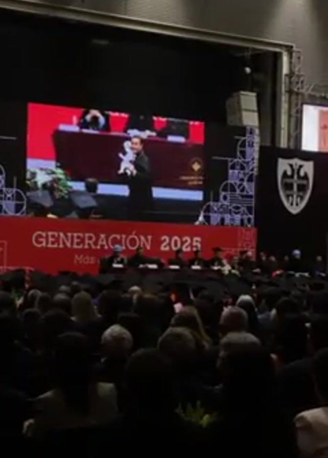 Here's a detailed description of the video: The scene captures a graduation ceremony in a large auditorium. A large screen displays a speaker on stage. A crowd of graduates in gowns and mortarboards sits in the audience. The stage backdrop features the words "GENERACION 2025" in large letters. To the right of the screen is a university logo. A male speaker is visible on the screen, holding a microphone and addressing the audience. The lighting is bright and the atmosphere appears formal and celebratory. The perspective is from the back of the audience, providing a wide view of the event.