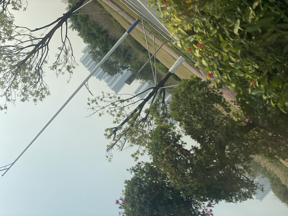 The photo captures a landscape featuring trees with sparse foliage and bare branches against a hazy sky. A tall, white pole intersects the scene diagonally, supporting what seems to be an infrastructure element. Buildings are faintly visible in the background, interspersed with greenery. Vegetation of varying densities, including bushes and trees with fuller leaves and some pink blooms, fills the right side of the frame.