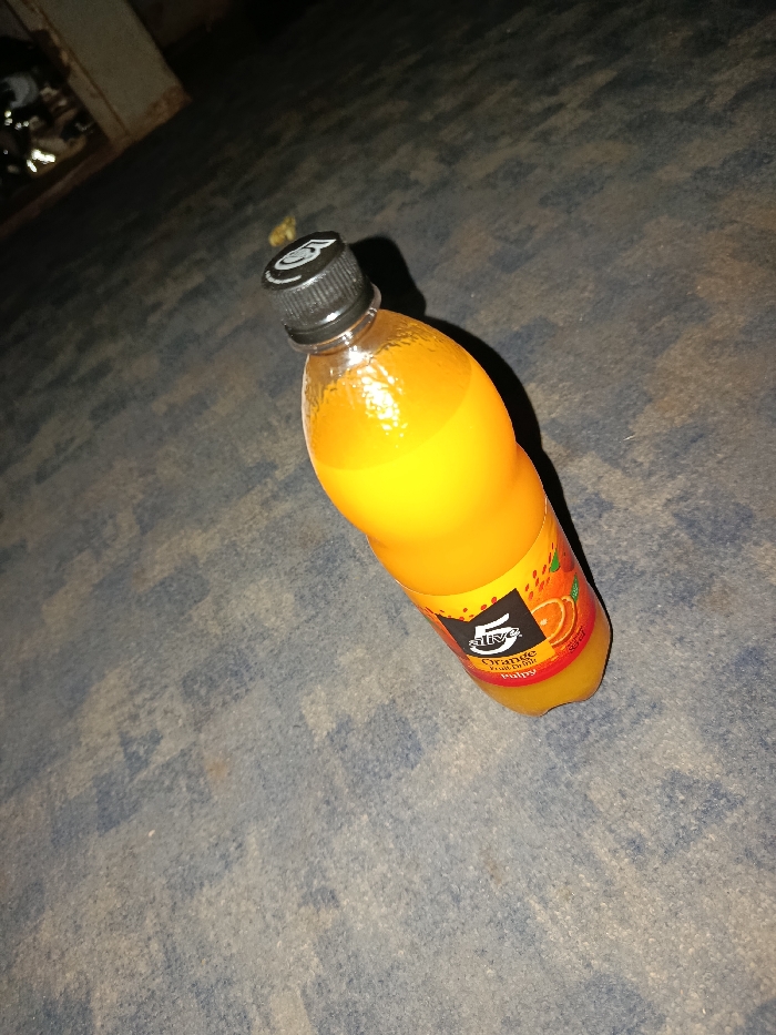 An angled close-up shows a plastic bottle of orange juice lying on a carpeted floor