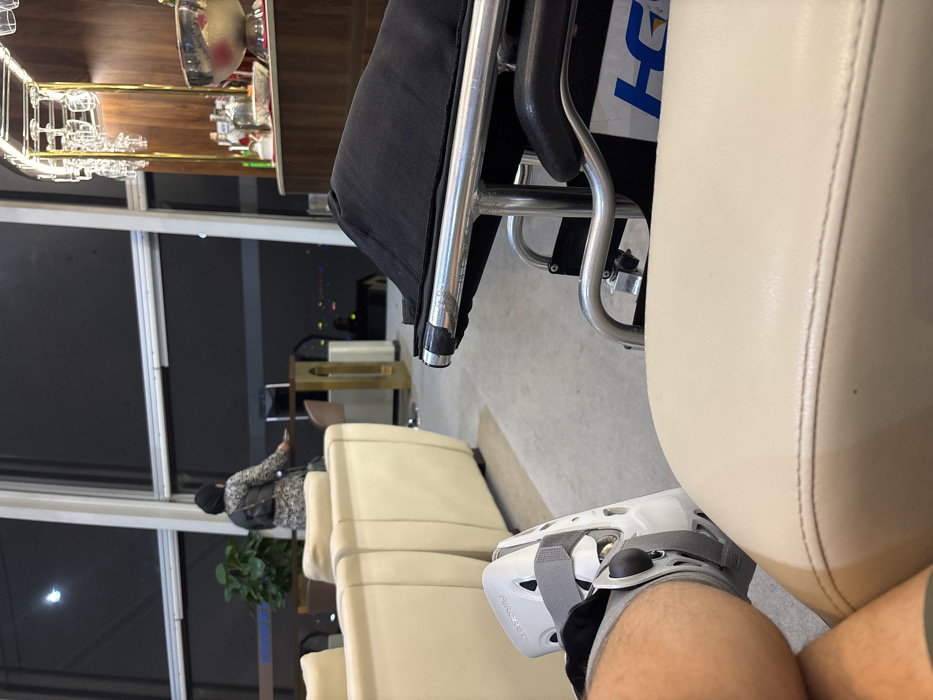 The image depicts an indoor lounge area at night, observed from a seated, first-person perspective. The location is in the city of Hà Nội, Vietnam, evident from distant city lights visible through large windows. In the immediate foreground, a left lower leg, fitted with a white "AIRCAST" medical boot, rests on a light-colored upholstered surface, presumably the viewer's seat. Adjacent to this, on the right, is the back of a silver-framed wheelchair with a black fabric seat and a visible "HG" logo on a sticker affixed to its frame. The midground features a row of light-colored, upholstered lounge seating. Further back and slightly to the left, a single individual is visible from behind, wearing a dark head covering and a patterned jacket, standing or sitting at a high counter or table. To the right, a wooden bar or service counter is equipped with an illuminated overhead rack displaying several wine glasses, various bottles, and a large silver bowl. The background consists of extensive floor-to-ceiling windows revealing a dark night sky. A crescent moon is prominently visible in the upper left portion of the sky through the window. Below the window line, numerous dispersed city lights are visible, indicating a high vantage point overlooking the urban landscape. The overall environment suggests a commercial or public lounge setting, possibly an airport or a high-rise establishment.