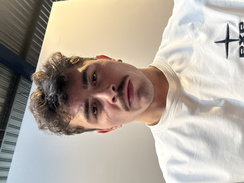 An adult male with fair skin, dark curly hair, a dark mustache, and dark eyebrows is depicted in an indoor setting in Chantepie, France. He wears a light-colored, possibly off-white, long-sleeved crew-neck shirt or sweatshirt featuring a dark embroidered logo on the lower left chest, comprising a cross-like symbol above the letters "PXP." A small silver hoop earring is visible in his left ear. The subject maintains a neutral expression, looking directly into the camera. The background consists of a plain, light-colored wall or partition, with a corrugated metal ceiling and structural elements visible above, suggesting a commercial or industrial building interior. The lighting appears even, with a warmer tone on the right side of the background.