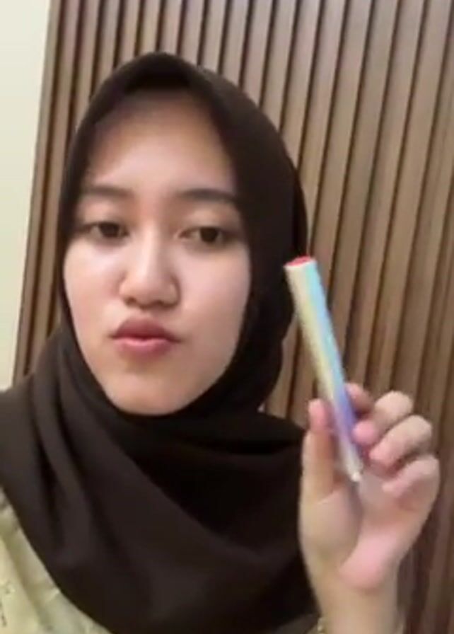 A young woman in a brown hijab and light-yellow floral blouse presents a make-up item. She is fair-skinned with braces on her teeth. She holds the item, which appears to be a lip gloss or lipstick with a multi-colored tube, close to the camera. The background is a wall with vertical wooden panels. The lighting is soft. She appears to be filming herself, possibly for social media.