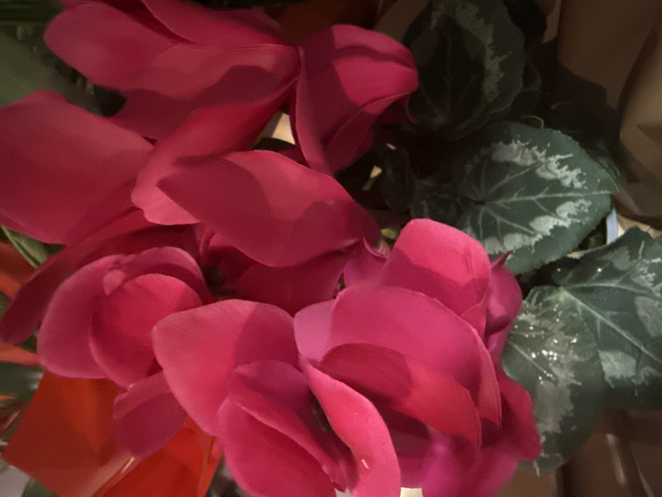 The scene, situated in the city of Byala Slatina, Bulgaria, depicts a close-up, static view of a potted plant. The primary subjects are a cluster of multiple vibrant fuchsia-colored flowers, consistent with Cyclamen species, characterized by their upward-swept petals and deep coloration. Beneath the prominent floral display are several dark green leaves, each exhibiting distinct silver-white variegated patterns across their surfaces. A portion of a reflective, glossy red material is visible in the upper left background, possibly a decorative wrap or an adjacent object. The base of the plant, including its container, is enveloped in light brown wrapping material, likely paper, visible in the lower right and central bottom areas of the frame. No individuals are present, and no actions or interactions are depicted within this indoor botanical setting.