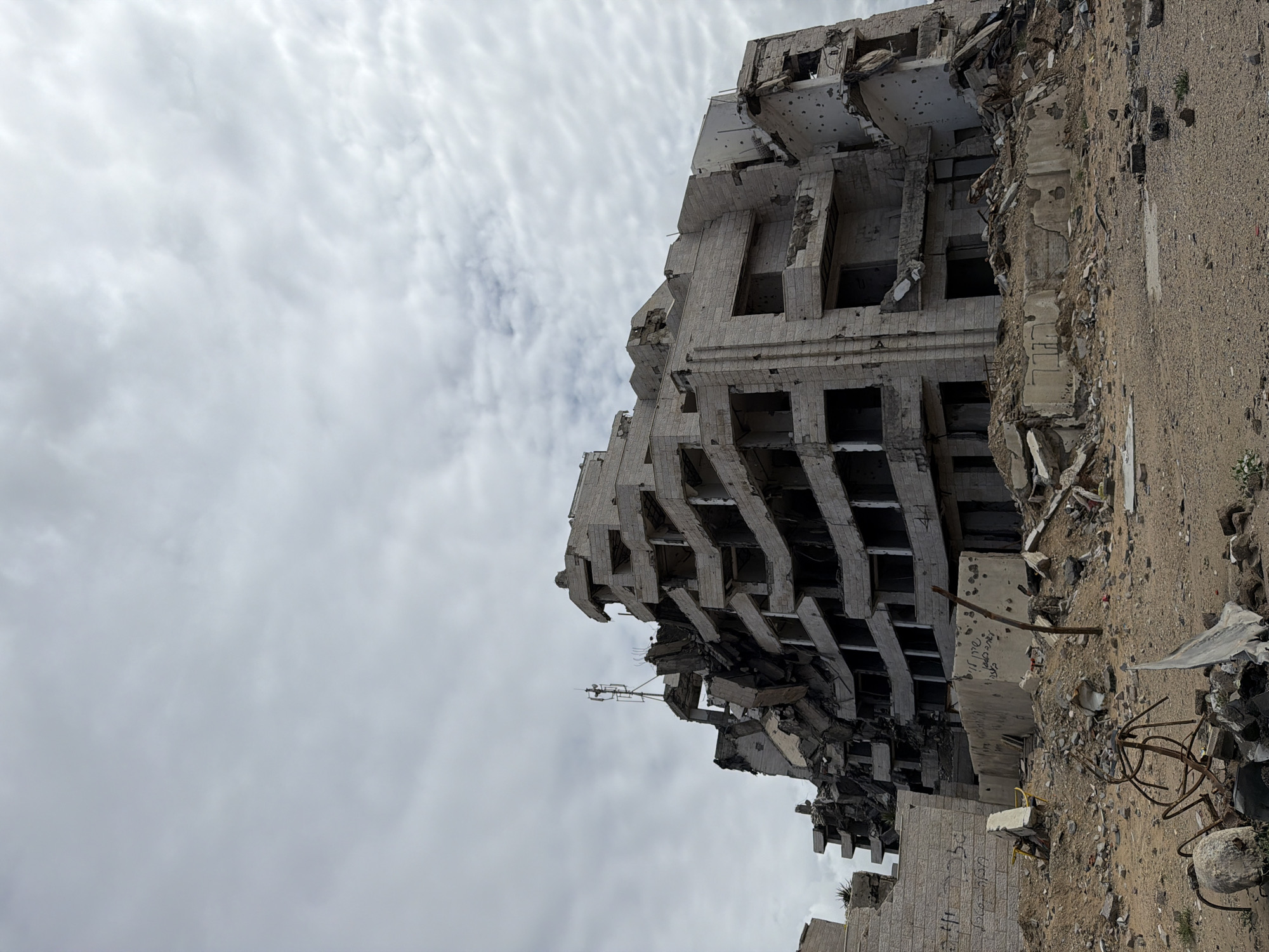 severely damaged multi-story building located in the city of Gaza, Palestinian Territory, under an overcast sky