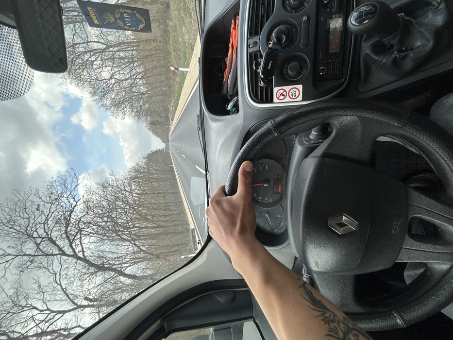 The image depicts a scene stated to be in Tsarkva, Bulgaria, captured from the interior of a moving vehicle. A light-skinned human left arm and hand are prominently positioned in the foreground, gripping the left side of a black, perforated leather-wrapped steering wheel, which features a central silver Renault logo and "SRS AIRBAG" text. A dark-inked tattoo, consisting of stylized wing-like or abstract patterns, is visible on the inner left forearm. The vehicle's dashboard is grey and black. The instrument cluster shows a speedometer with the needle indicating approximately 115 km/h, and a digital display reads "02/09 1105." A central console contains air vents, climate control dials, and a radio/media player. A black "hoco." branded phone mount is clipped to a central air vent. A white warning sticker, displaying a red circle with a diagonal line over a phone symbol and "490 MAX" text, is adhered to the dashboard to the right of the steering wheel. A black "Areon VIP" branded car air freshener hangs from the rearview mirror. Various items, including what appears to be an orange safety vest, are stowed in a recess above the central console. In the lower right, a manual gear shifter with a black knob is visible; the leather boot at its base appears worn or torn. Beyond the windshield, a straight, two-lane asphalt road with white lane markings extends into the distance. The road is bordered on both sides by dense, bare deciduous trees, suggesting a late autumn or early spring environment. A lighter-colored shoulder, possibly gravel, runs alongside the asphalt. Red and white striped reflective delineator posts are visible at intervals along the right side of the road. The sky above is partly cloudy, with significant cloud cover punctuated by patches of blue.