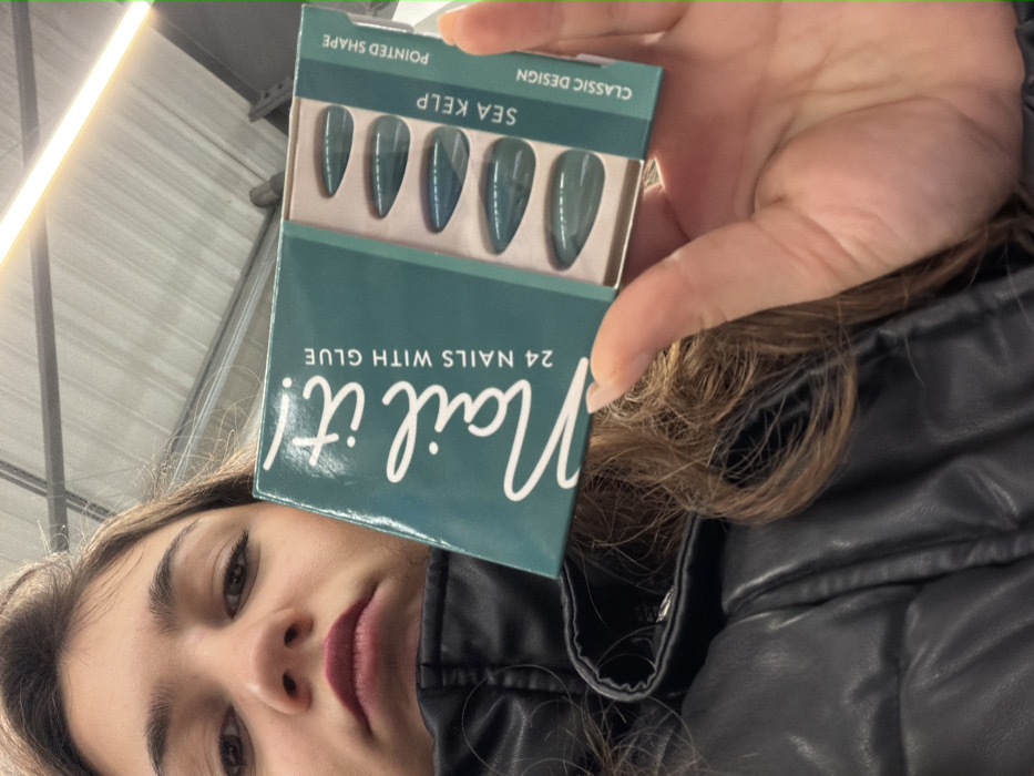 A person holds a box of "Nail it!" brand artificial nails in "Sea Kelp," a set of 24 pointed-shape nails with glue. The box is green with white lettering and features a display of the nails inside. The person is wearing a black leather jacket and has brown hair. A fluorescent light fixture is visible in the background. The person is looking at the camera.