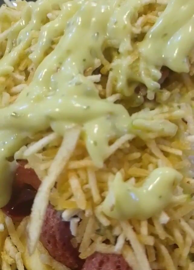 A close-up shot shows a plate of food on a wooden surface. The food appears to be a mixture of thin-cut french fries, possibly chorizo or sausage slices, and a light green sauce drizzled generously over the top. Some white crumbles, possibly cheese, are also visible. The lighting is somewhat diffused. The plate is black. A dark object is partially visible in the upper left corner of the frame.