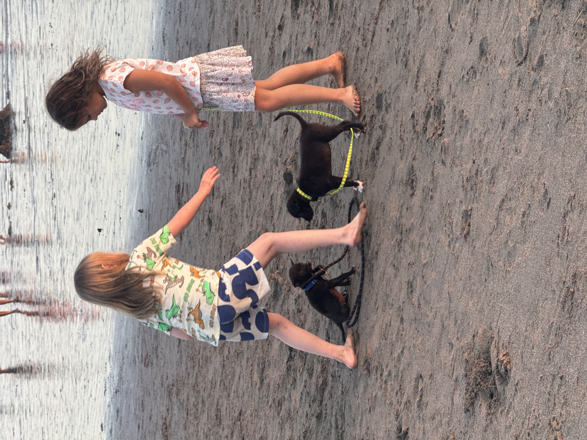 Two children, a girl with brown hair and a patterned white and pink dress, and a girl with long blond hair wearing a dinosaur-patterned shirt and blue and white shorts, stand on a beach with two dark-colored puppies
