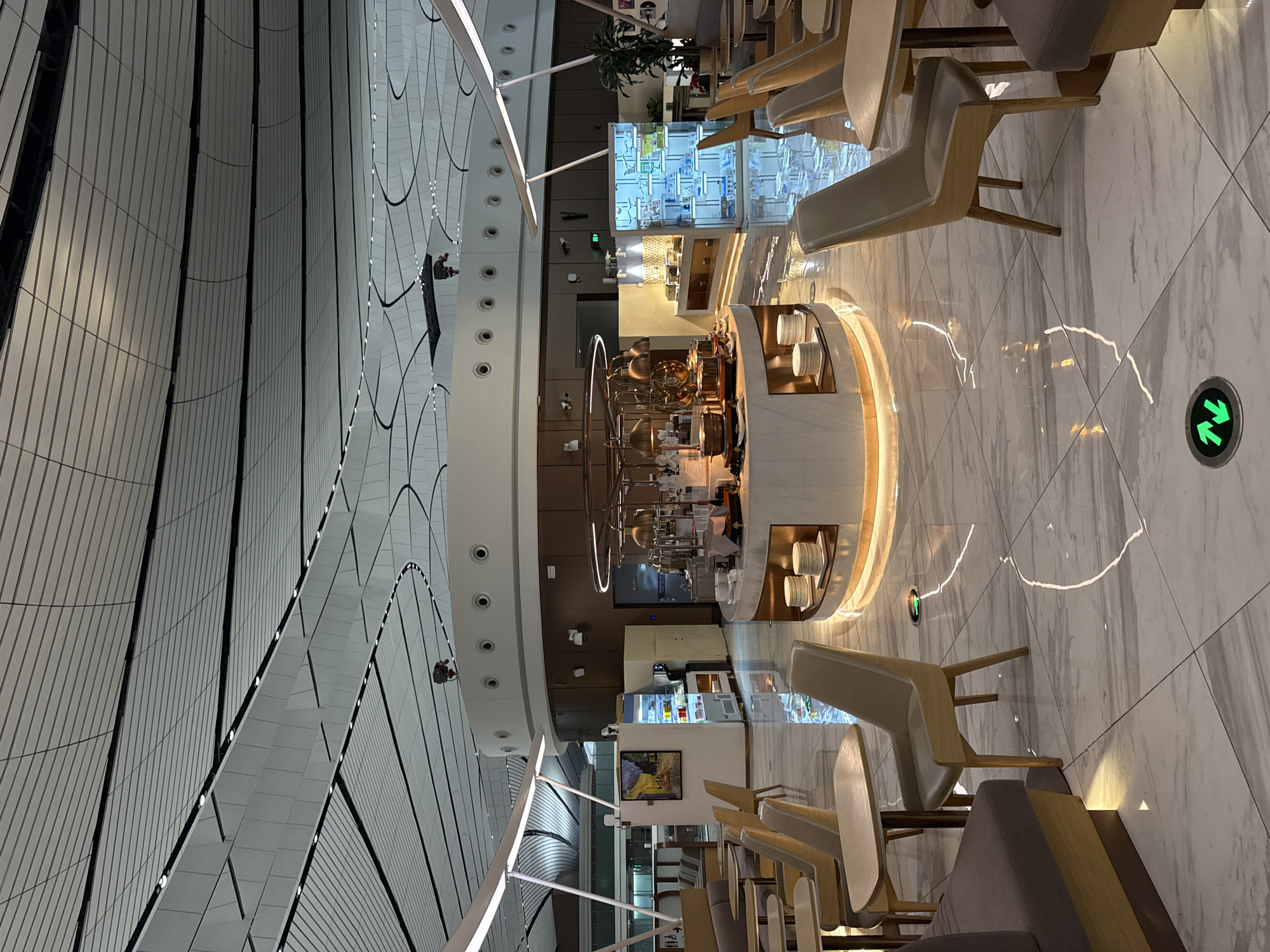 The image depicts the interior of an airport, possibly located in Langfang, China. The architectural design is characterized by a high, curved ceiling featuring linear patterns and recessed lighting. A prominent circular bar or service counter occupies the center of the space, illuminated with integrated lighting. Adjacent to the bar, several chairs and lounge seating are arranged, indicating a waiting area. The flooring is made of marble-like tiles, reflecting ambient light. A green directional sign with arrows is visible on the floor. No people are clearly visible, although there are potential figures in the reflections in the windows.