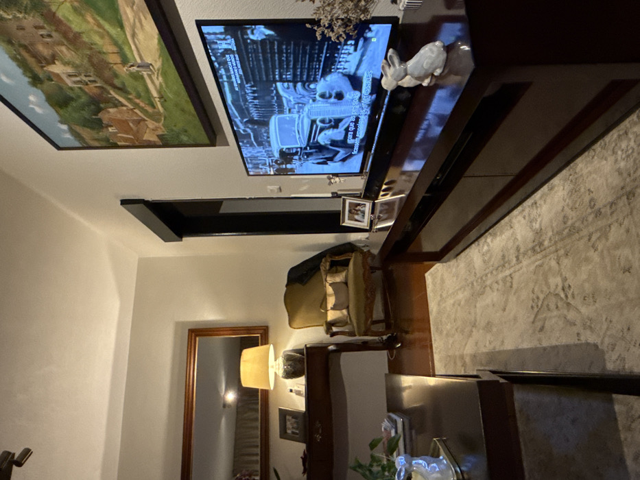 This image depicts an interior living room located in Cascais, Portugal. The scene is illuminated by artificial light, casting a warm ambiance. In the immediate foreground on the left, a dark brown, rectangular coffee table is visible, holding a small plant in a white pot. A light-colored patterned rug covers a portion of the dark wood floorboards, extending towards the center of the room. To the right, a long, dark brown TV console with multiple storage compartments supports a large, flat-screen television. The TV displays a black-and-white scene featuring vintage cars and individuals, accompanied by Portuguese subtitles stating "para que as pessoas ficassem empolgadas e interessadas" and a "HISTORY" channel logo. On the console, to the right of the TV, a white ceramic rabbit figurine is positioned alongside a small arrangement of dried flowers. A small framed photograph is also present to the left of the TV. Against the far left wall, a dark wood console table features a table lamp with an amber-colored shade and a dark, decorative base, flanked by two framed photographs. Above this console, a large rectangular mirror with a dark wood frame reflects the ceiling light. Adjacent to the console table, a dark wood armchair with ornate carvings and light olive-green upholstery holds a lighter-colored cushion, with a dark jacket draped over its back. Above the television, on the light-colored wall, hangs a large framed landscape painting depicting rolling green hills and buildings. A dark-framed doorway or opening is visible on the right side of the image, leading to an unseen area. The walls are light-colored, and the ceiling, also light-colored, shows a visible recessed lighting fixture in the upper left corner. No individuals are present in the scene.