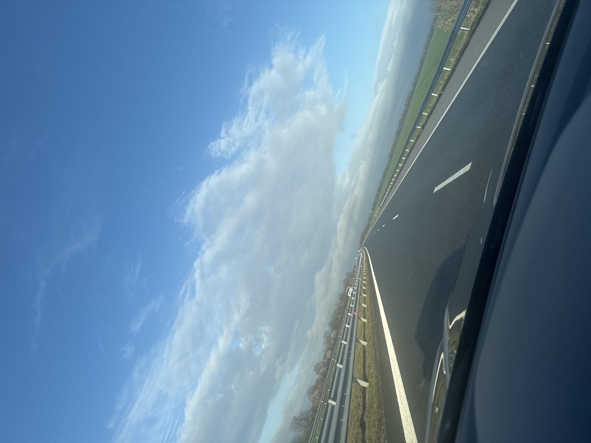 The image depicts a multi-lane asphalt highway on a clear day with scattered clouds, viewed from inside a moving vehicle. The location is specified as Vodenichane, Bulgaria. The foreground shows the dark dashboard or hood of a vehicle occupying the bottom approximately 15% of the frame. The highway extends from the lower center towards the horizon, featuring dark asphalt. On the left side of the road, a solid white line marks the shoulder, followed by a wide solid white line, then a dashed white line indicating a lane divider. On the right side, a solid white line delineates the shoulder. Metal crash barriers (guardrails) run parallel to the road on both sides. The barrier on the left consists of three horizontal rails supported by vertical posts, separating the highway from a strip of grass and then a line of leafless deciduous trees. The barrier on the right also features multiple horizontal rails, bordering a green field which extends to the distant horizon where a faint line of trees is visible. Several small orange traffic cones or markers are interspersed along the right crash barrier. In the distance on the opposing lanes (to the left of the central barrier), a white car is visible. The sky occupies the upper portion of the image. The upper-right quadrant is clear blue. A band of white and light grey cumulus clouds stretches diagonally from the mid-left towards the far right horizon, with some darker grey cloud formations present on the right. No individuals are visible, though the perspective indicates a person is operating or riding in the vehicle from which the photograph was taken.