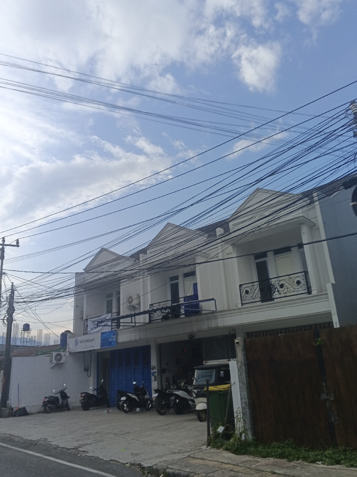 The image displays a daytime street scene in Kon Tum, Vietnam, featuring a two-story commercial and residential building under a partially cloudy blue sky. The building, constructed in three connected units, exhibits white facades with dark gabled roof sections and ornate black metal balconies on the upper floor. Air conditioning units are mounted on the exterior walls of the upper level. The ground floor of the leftmost unit features a blue roll-up door with a "FIFGROUP" sign above it, while the adjacent ground-floor unit has an open, garage-style entrance. Numerous overhead electrical and communication cables crisscross the upper portion of the frame, connecting to a utility pole on the far left. In the foreground, a paved sidewalk separates the building from a dark asphalt road. Multiple motorcycles are parked on the paved area in front of the building's ground-level entrances. A white three-wheeled utility vehicle is parked near the open garage entrance, beside a green waste bin. To the right of the building, a dark brown wooden fence or wall is visible. In the distant background, on the far left, a water tower and a cluster of developing urban structures are discernible against the horizon. No individuals are depicted.