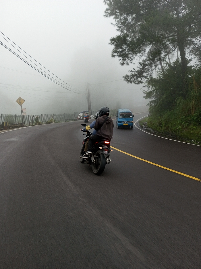 The image depicts a foggy road scene in Ariyalai, Sri Lanka. A black motorcycle with an operator, wearing a dark helmet, dark jacket, dark pants, and light-colored gloves, is navigating a wet, asphalt road that curves to the left from the viewer's perspective. The motorcycle's red tail light is illuminated. A solid yellow line marks the road's surface. Dense fog significantly obscures visibility, extending across the entire scene. On the right side of the road, thick green vegetation and a large evergreen tree are present. On the left, a metal fence, a yellow diamond-shaped road sign, and utility poles with overhead wires are visible. Further along the curve on the left, a second motorcycle with at least one rider is faintly discernible. A light blue van is traveling in the opposite direction on the far side of the road's curve, partially obscured by the fog.