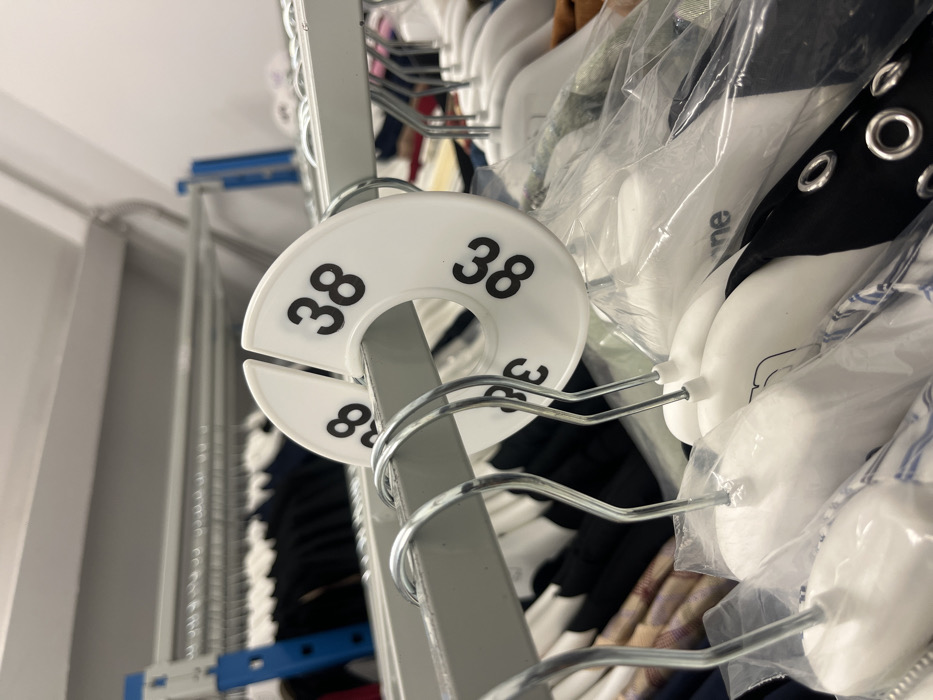 A close-up shot shows a clothing rack filled with garments on hangers. The garments are mostly obscured by plastic coverings. A white, circular size divider labeled "38" in bold black font is attached to the rack. The divider is split, allowing it to be easily added or removed. The rack itself is a light gray metal. The background includes other racks and clothing, suggesting a retail or storage environment.