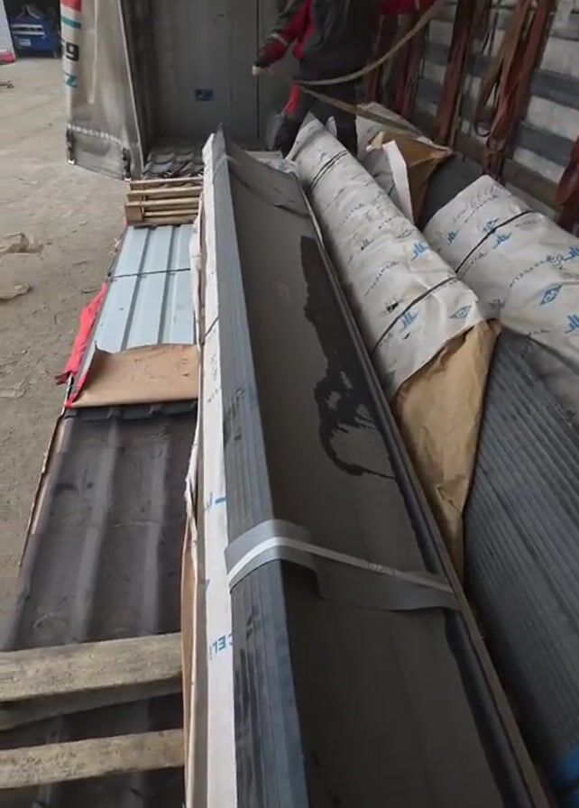 A semi-truck trailer is open with a view of its contents. The trailer contains stacks of wrapped metal sheets and rolls of building material. A man wearing a winter hat and jacket is inside the trailer, manipulating the materials with a long object. A wooden pallet is positioned on the ground, leading into the trailer's back. There are several people walking around outside near a large industrial building. The ground is dirt and gravel. Another man walks toward the trailer. The viewpoint is from outside the truck, looking into the trailer bed.
