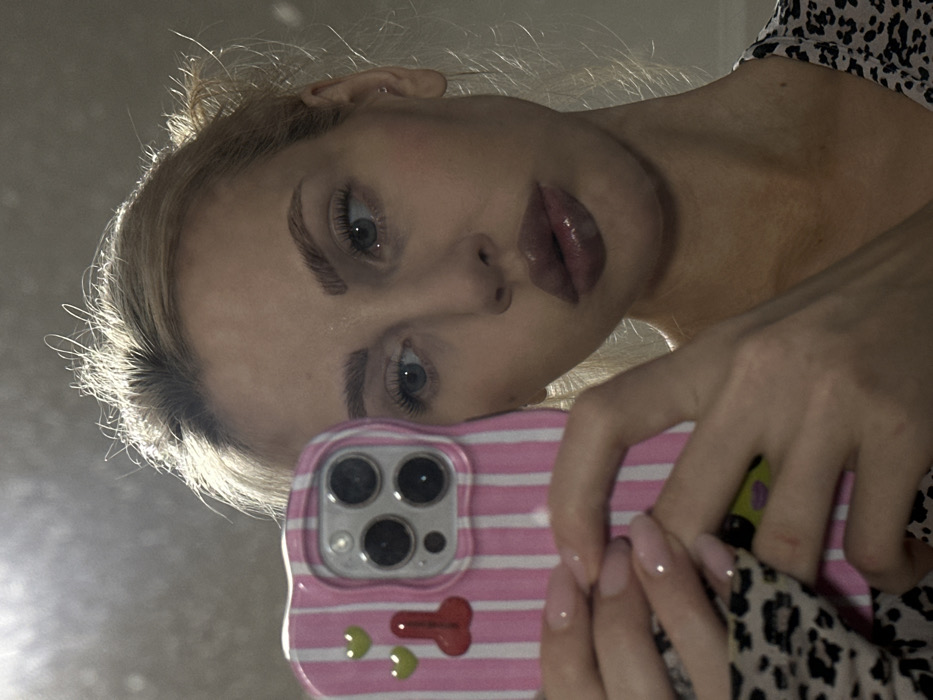 This image depicts a female individual taking a selfie indoors, located in the city of Vsevolozhsk, Russia. The subject is seen from the chest up, reflected in what appears to be a mirror, holding a smartphone with both hands. Her blonde hair is pulled back, exhibiting visible flyaways, with bright highlights suggesting an overhead or strong light source. She has blue eyes, defined eyebrows, and full lips coated with a glossy, dark nude or brown substance. A small stud earring is present in her right ear. Her fingernails are manicured with a light pink polish. She is wearing a garment with a black and white leopard print pattern visible on the left side of the frame, and a speckled light-colored top on the right. The smartphone, likely an iPhone with a triple-lens camera system, is encased in a pink cover with white vertical stripes. The phone case is adorned with two green heart-shaped stickers or emblems and one red phallic-shaped emblem. The background is indistinct, appearing as a plain, lightly colored wall or surface, out of focus.