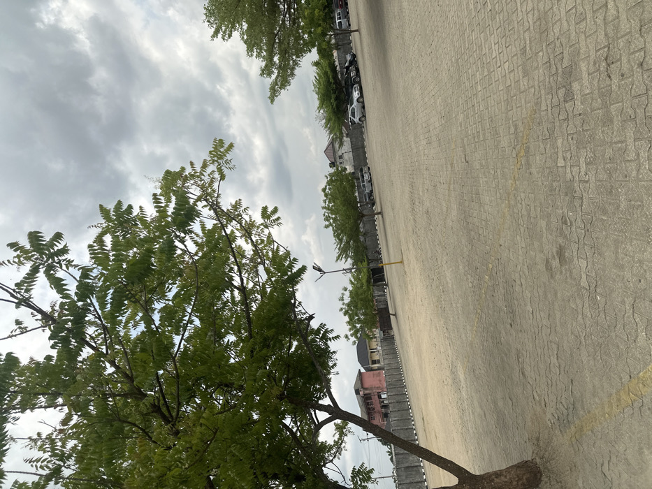 The image displays an expansive outdoor paved area, likely a parking lot or plaza, located in Ozuaha, Nigeria, under an overcast sky. The foreground features a large tree with green foliage on the left, partially obscuring the upper left corner of the frame. The ground is surfaced with light-colored interlocking concrete pavers, exhibiting faint yellow line markings consistent with parking space delineation. In the midground, the paved area extends towards a perimeter wall composed of light grey concrete blocks topped with black and white striped bollards. Several smaller trees with green canopies are evenly distributed across this paved expanse. A black street light pole equipped with a solar panel and a yellow base is visible to the left-center. Beyond the perimeter wall, the background reveals various structures and parked vehicles. On the far left, a two-story building with reddish-pink walls and a dark roof is partially visible. Further right, other lighter-colored buildings are present. A line of vehicles, including cars and SUVs, is parked behind the wall and smaller trees on the right side of the frame. The sky is predominantly grey, covered with dense clouds. No individuals or discernible actions are present within the scene.
