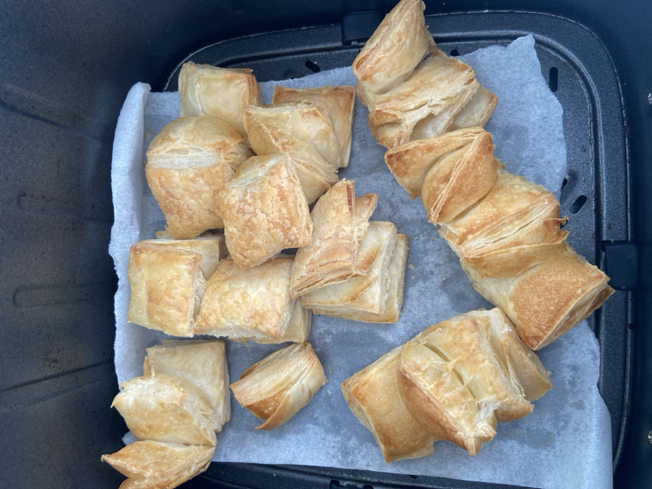 The image displays an overhead view of numerous golden-brown puff pastry items contained within the black, perforated basket of an air fryer