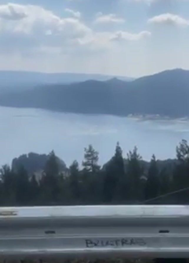scenic view from a high vantage point, likely a roadside overlook, capturing a large lake surrounded by rolling hills and forested areas. The sky is blue with scattered clouds. The shot is partially obstructed by a metal guardrail, which has graffiti on it. The ground near the guardrail shows signs of litter. The camera is static, suggesting the video was taken from a parked vehicle or stationary location.