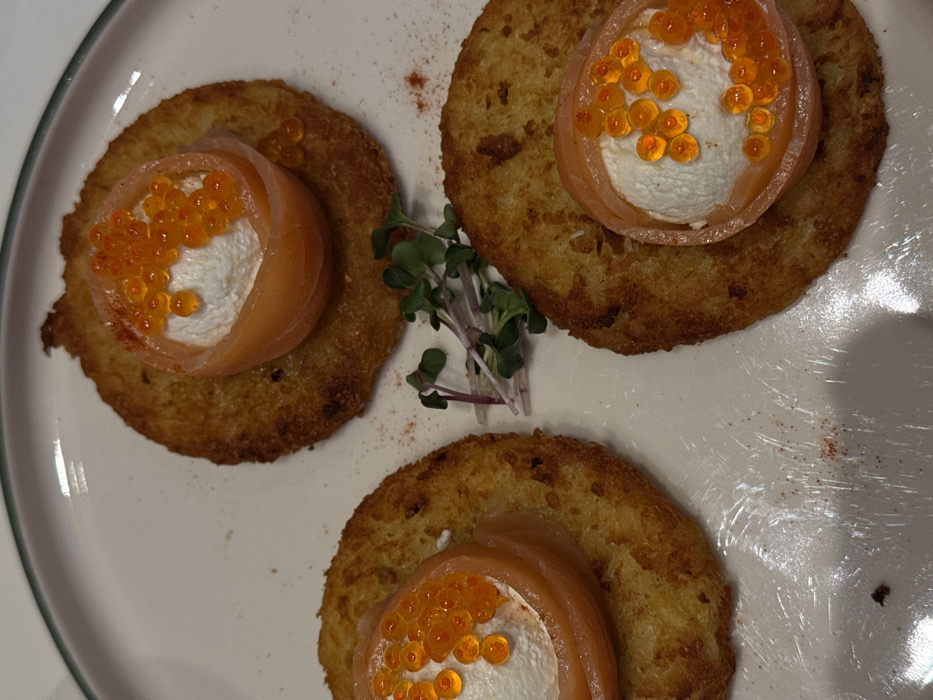 - "Three potato pancakes, each topped with a roll of smoked salmon filled with cream cheese and salmon roe, are arranged on a white plate" by FM-7mF7g2, licensed under CC BY 4.0