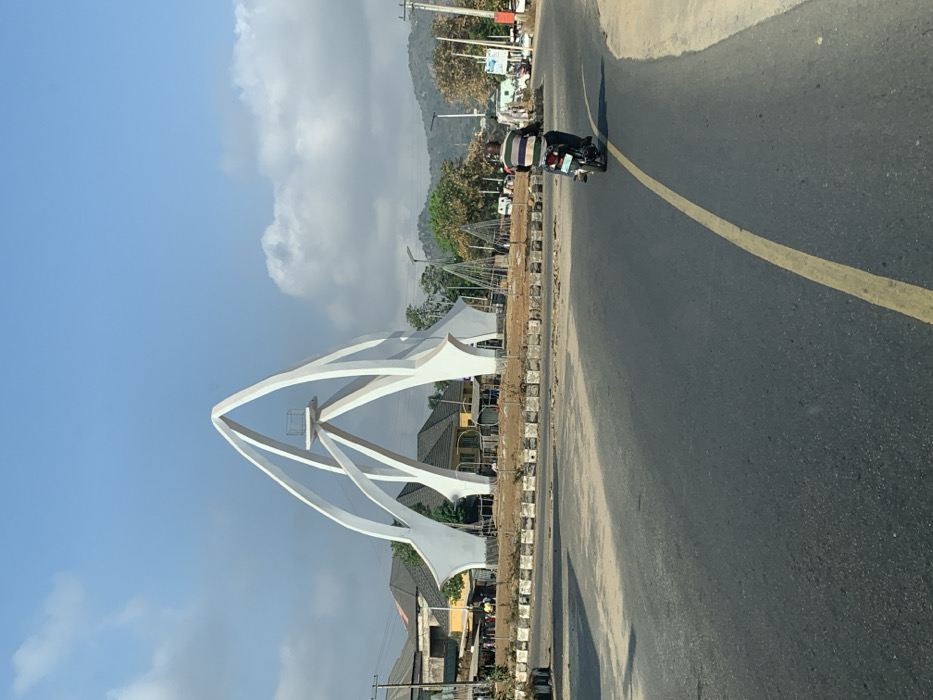 The image depicts the main roundabout in Okene, Kogi State, Nigeria, under a bright, partly cloudy sky