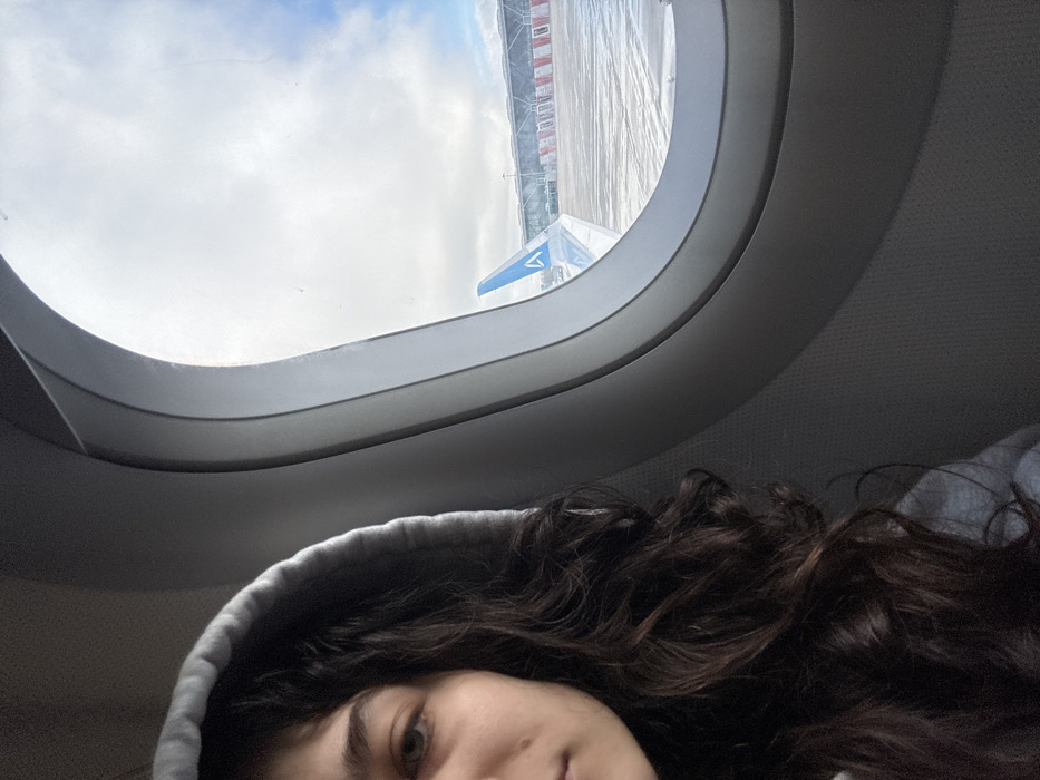 - "An interior view from an aircraft captures a partial image of a female passenger on the left and an airport scene outside the window on the right" by FM-TuRmC3, licensed under CC BY 4.0
