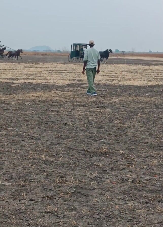A man in light-colored pants and shirt, facing away from the camera, stands in a dry, harvested field. In the background, several horse-drawn carriages move across the field. The carriages are green and black. Some are carrying people. The overcast sky and distant hill add to the backdrop of the scene.