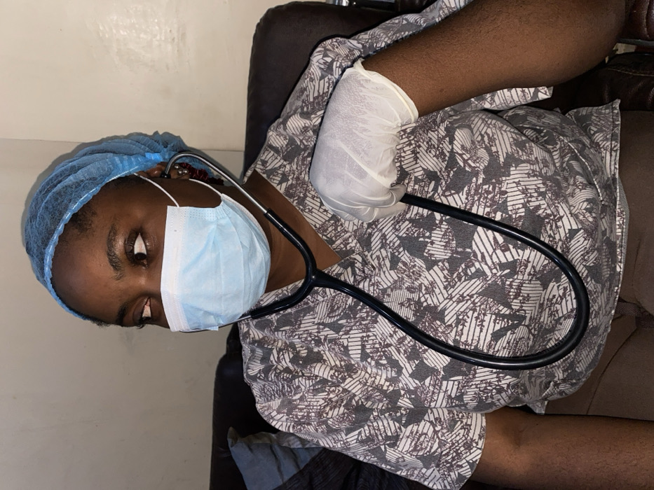 A healthcare worker sits, wearing a light blue surgical cap and a disposable face mask
