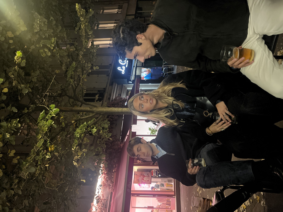 The image captures an outdoor nighttime scene on Rue Saint-Honoré in Paris, France. The specific location is identifiable by the neon sign for "Le Cercle Bar à Tapas, depuis 1930" at 122 Rue Saint-Honoré, and the adjacent pink-lit establishment, "O'Sha Brunch & Bubble Tea," visible to the left at 120 Rue Saint-Honoré. Three young adults are seated at an outdoor table. On the left, a male with light brown hair, wearing a dark blue quarter-zip sweater over a light blue shirt and dark jeans, holds a glass containing a light-colored beverage. He is looking towards his left. In the center, a blonde female, wearing a dark coat, dark pants, and a black crossbody bag, holds a glass with a similar light-colored beverage. She displays multiple rings on her fingers and a gold bracelet on her left wrist, and is looking towards her right. On the right, a male with dark curly hair, wearing a dark jacket and light-colored pants, holds a glass with a light-colored beverage and is looking towards his left, in the direction of the female. A tree with green leaves dominates the upper center of the frame, separating the individuals from the background buildings, which exhibit illuminated windows. Fallen leaves are visible on the sidewalk. Artificial lighting illuminates the scene.