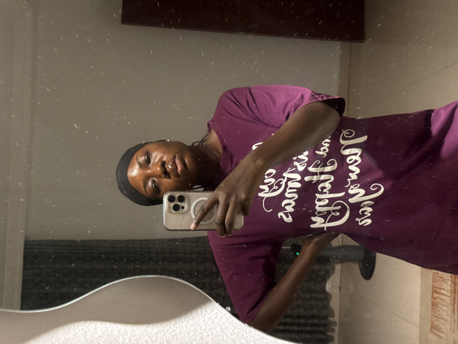 A woman with dark skin and a black headband takes a selfie in a mirror. She's wearing a burgundy t-shirt with white text. Her right hand holds an iPhone with three camera lenses. The mirror is speckled with dust and reflects parts of a bathroom, including a wooden cabinet, a white basin with a curved edge, and a portion of a tiled wall. A green light is visible on the wall behind her.