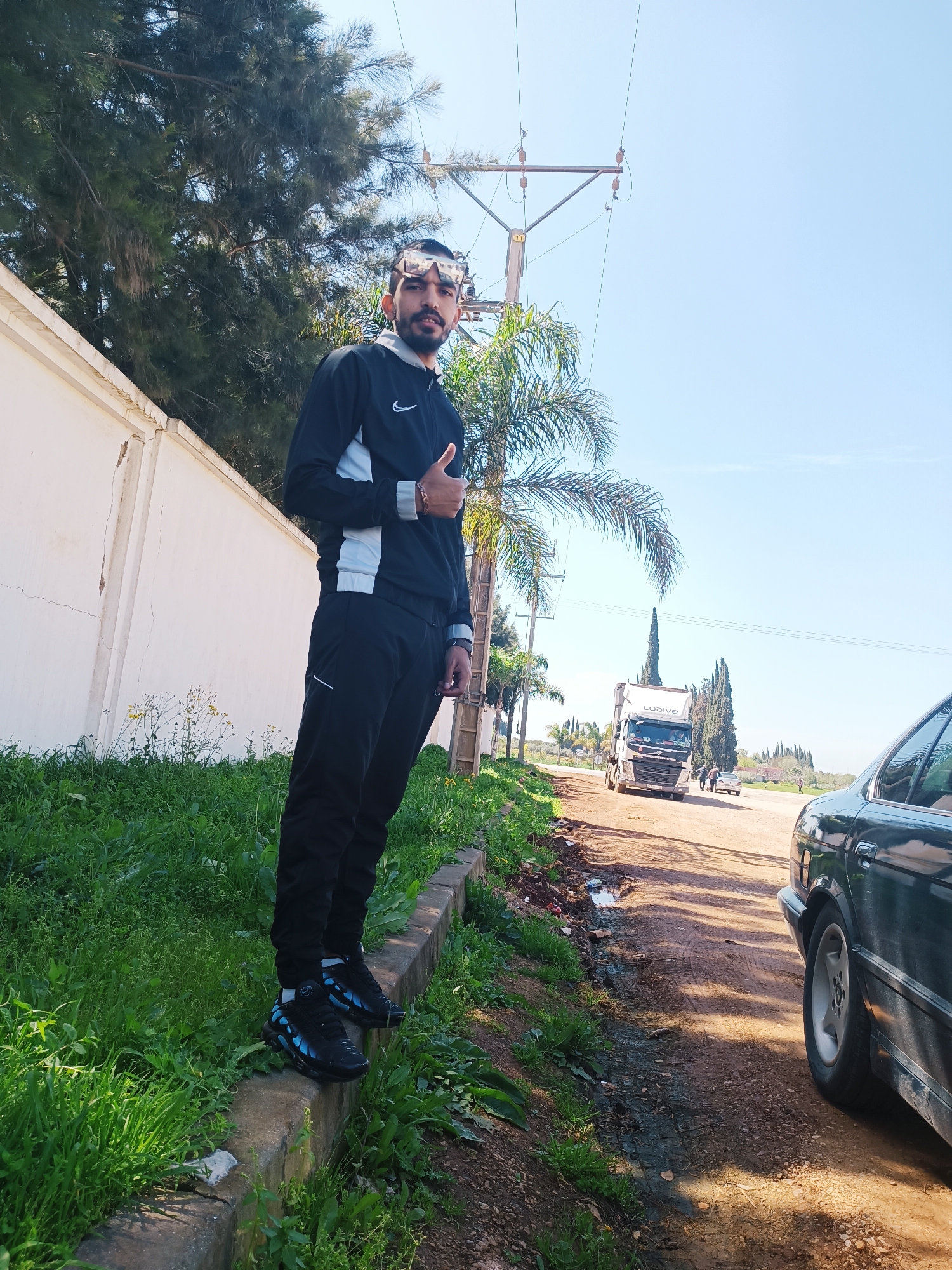 The image displays an outdoor scene under a clear blue sky in the city of Unknown, Unknown. A male subject, with a beard and mustache, stands in the left foreground on a concrete curb, facing the camera with his right hand extended in a "thumbs up" gesture. He wears a black and white Nike tracksuit, black athletic shoes with prominent blue elements, and reflective sunglasses pushed onto his forehead. Behind him on the left is a white, weathered wall with visible cracks, bordered by a grassy embankment containing green foliage and small yellow flowers. The curb separates this area from an unpaved dirt road that extends into the background. A dark-colored sedan is partially visible on the right side of the dirt road in the mid-ground. Further down the road, a white semi-truck with "LODIVE" visible on its side, along with other vehicles and several pedestrians, can be seen. A utility pole with power lines stands in the mid-ground, partially obscured by a palm tree. Various trees, including pine and cypress-like evergreens, are scattered throughout the background.