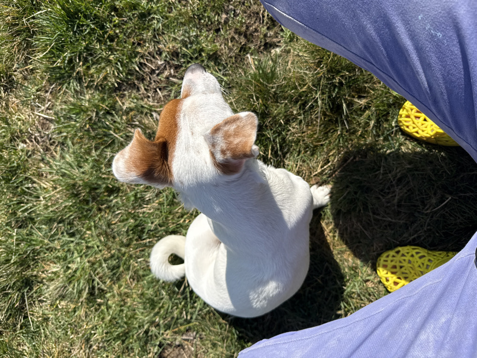 The image captures an overhead view of an outdoor scene in Galabovtsi, Bulgaria, under clear, sunny conditions. The lower legs of an individual are visible in the foreground, clad in light blue fabric trousers and bright yellow, open-weave footwear. To the upper-left of the person's feet, a small, short-haired dog stands on green grass. The dog is predominantly white with tan-brown markings on its head and ears, and its tail is curled in a tight spiral over its back. It is oriented away from the viewer, facing towards the right. Distinct shadows from both the person and the dog are cast upon the grass. The ground consists entirely of green grass.