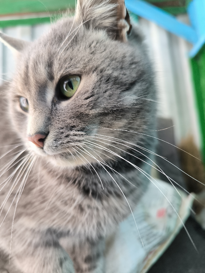 This image, taken in Parkhomivka, Ukraine, presents a close-up, headshot perspective of a domestic cat. The animal is a grey tabby, characterized by its soft, short grey fur with darker grey stripes visible across its face, forehead, and neck. Its left eye, prominently featured, is a striking vivid green, while its right eye is partially visible and also green. The cat possesses a small, pink nose and numerous long, white whiskers extending outward from both sides of its muzzle. Its left ear is partially visible, erect and furred. The cat's head is turned slightly to its left, with its gaze directed in the same general direction, slightly downward. The background is significantly blurred, indicating a shallow depth of field. Visible blurred elements include light blue and green structures in the upper and right portions of the frame, and an indistinct, light-colored object or surface, possibly paper or fabric, located below the cat's chin and extending into the lower right corner. The lighting appears soft and uniform, illuminating the cat's facial features without harsh shadows. No human subjects are present or implied, and the cat is static.
