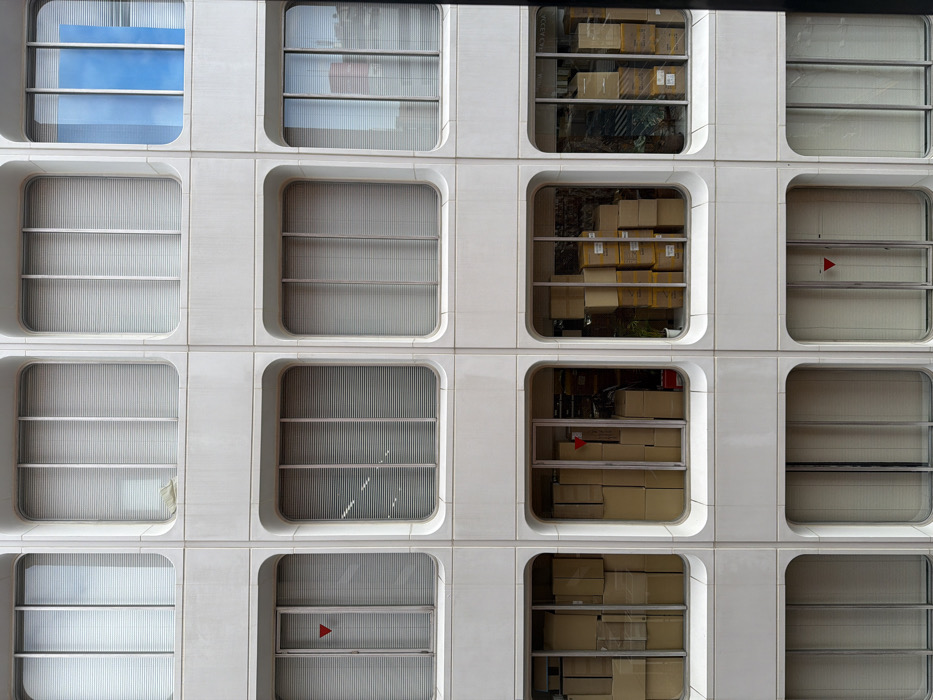 A building facade featuring a grid of square windows. The windows are inset with rounded corners and contain either shelving or opaque blinds. Some windows reveal stacked cardboard boxes, suggesting storage. One window reflects blue sky. The overall aesthetic is clean and minimalist with a focus on repetitive geometric forms. Two red triangular stickers appear in the lower corner of two separate windows.