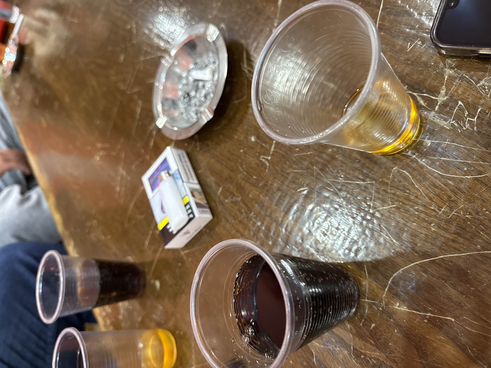 wooden table in what is likely a bar or cafe. The table contains a plastic cup partially filled with a light-colored liquid, possibly beer or rakia. There is a cigarette pack, an ashtray filled with cigarette butts and ash, two plastic cups containing dark liquids, possibly cola or another dark soda, and a mobile phone. The location is estimated to be in Sofia, Bulgaria. A person wearing a blue garment is visible on the left.