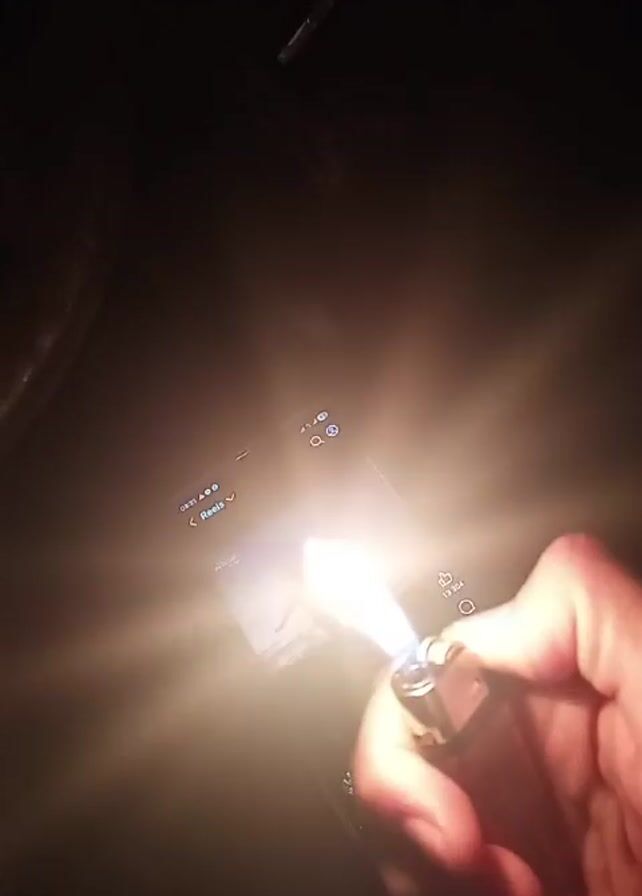 In a dimly lit setting, a hand holds a black lighter, its flame illuminating the screen of a smartphone. The phone displays a "Reels" section with a video thumbnail showing two figures silhouetted against a twilight sky, arms outstretched. Music plays in the background as the lighter's flame flickers intermittently. The overall scene is intimate, with the smartphone and lighter as central objects, suggesting personal use or contemplation.