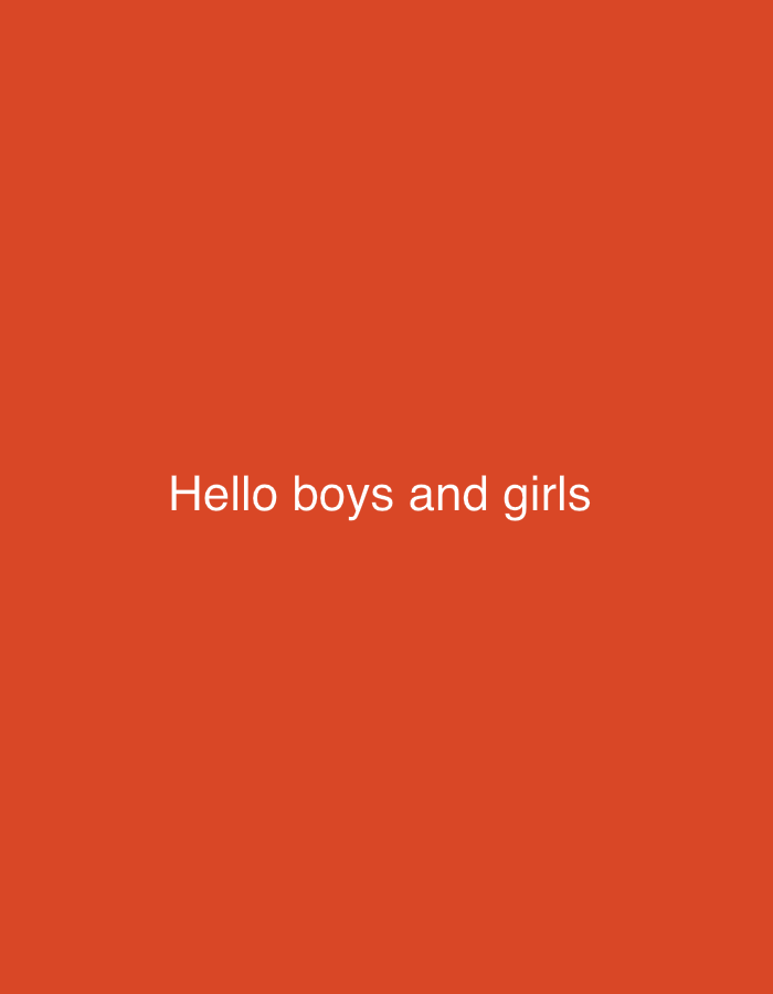 The image displays a solid, dark orange-red rectangular field. Centered horizontally and slightly above the bottom third of the frame, white sans-serif text reads "Hello boys and girls". The text appears in a medium font size, contrasting clearly against the background. There are no other discernible subjects, objects, people, actions, or interactions depicted. The scene presented is a graphic overlay on a plain background, offering no visual information to establish a specific physical location within the city of Sopot, Bulgaria, or any other geographical context.
