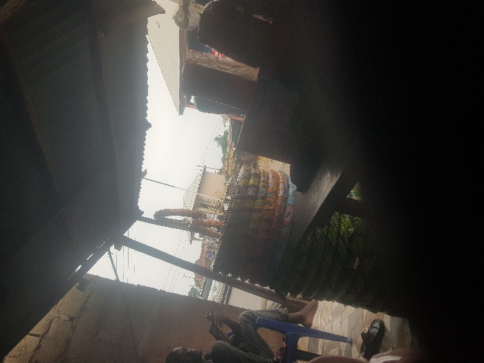 The image depicts an outdoor scene in Lokoja, Nigeria, viewed from beneath a dark, corrugated metal roof structure