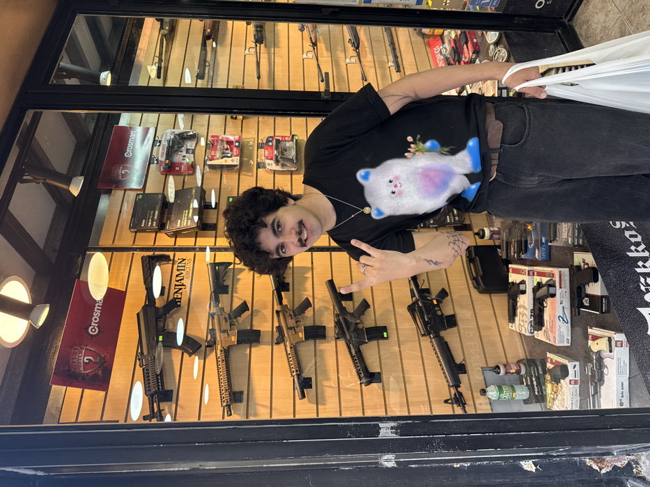 A man stands in front of a gun store window, giving the peace sign. He has dark curly hair and a mustache, wearing a black t-shirt with a cartoon animal. The window display features various air rifles and pistols, along with packaging for accessories like BBs and CO2 cartridges. Some boxes are stacked near the bottom, and branding labels are visible. The man is holding white plastic bags, suggesting he made a purchase.