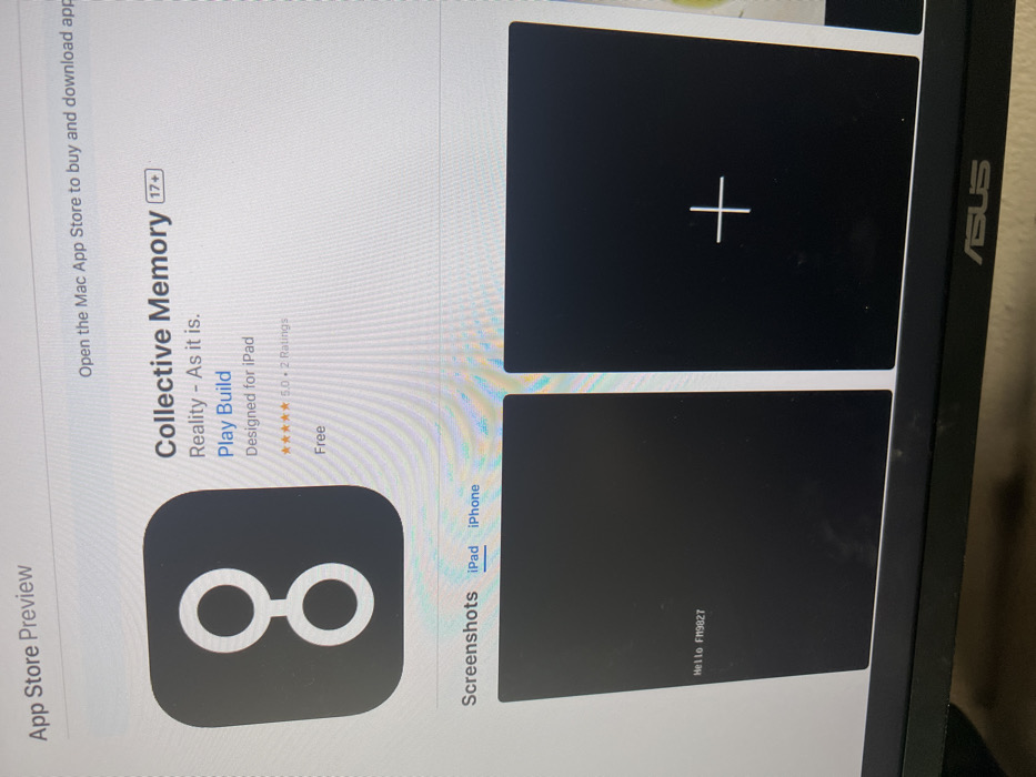 computer screen displaying an app store preview page for an app called "Collective Memory". The app is rated 5 stars with two ratings and is free. The app's logo is a black figure eight. The preview page also shows the app's description, which reads "Reality - As it is. Play Build Designed for iPad." Below the app's description are screenshots of the app. The screenshots show a black background with a white plus sign on the right. The text "Hello FM9827" is visible in the bottom left screenshot. The computer screen is also displaying the word "ASUS" on the bottom right. The location of the computer screen is unknown.