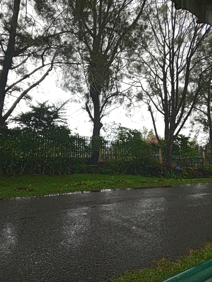 A wet road stretches across the foreground, framed by green grass. A fence with thick vegetation stands beyond the grass, partially obscured by trees. The trees dominate the view, their branches reaching towards a cloudy sky. The scene conveys a sense of stillness, likely after rain, in a natural setting bordering a paved road.