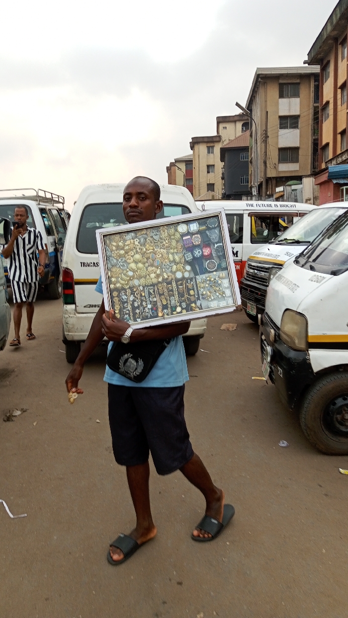 An adult male stands in a busy street in Onitsha, Nigeria, holding a rectangular display case