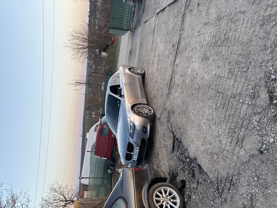 The scene depicts an outdoor, semi-urban environment in the city of Septemvritsi, Bulgaria, characterized by a deteriorated concrete and gravel surface. The time of day is either early morning or late afternoon, indicated by the sky's gradient from pale blue overhead to a light orange-pink near the horizon. A silver BMW E60 5-Series sedan is centrally positioned, parked facing forward on the rough ground. Its front-end is partially obscured on the left by a dark-colored sedan, likely an older BMW (E36/E46 generation), of which only the rear driver's side wheel with a five-spoke silver alloy rim and a portion of the body panel are visible. The silver BMW displays a Bulgarian license plate, "B 5808 XB," signifying Sofia City registration, and is fitted with aftermarket multi-spoke alloy wheels. The ground surface consists of heavily worn concrete mixed with loose gravel and dirt, showing significant cracking and exposed rebar in various sections. Multiple discarded cigarette butts are scattered across the ground in the foreground. In the mid-ground, a green metal fence spans horizontally, delineating the immediate parking area from a background plot. Behind this fence, a red van and a white van are parked. To the far right, another segment of a green metal fence or gate is visible. The background features several bare deciduous trees, suggesting a late autumn, winter, or early spring season. Distant low-rise buildings or a settlement are discernible on the horizon line, set against what appears to be a natural landscape of rolling hills. No individuals are present or engaged in any activity within the captured frame.
