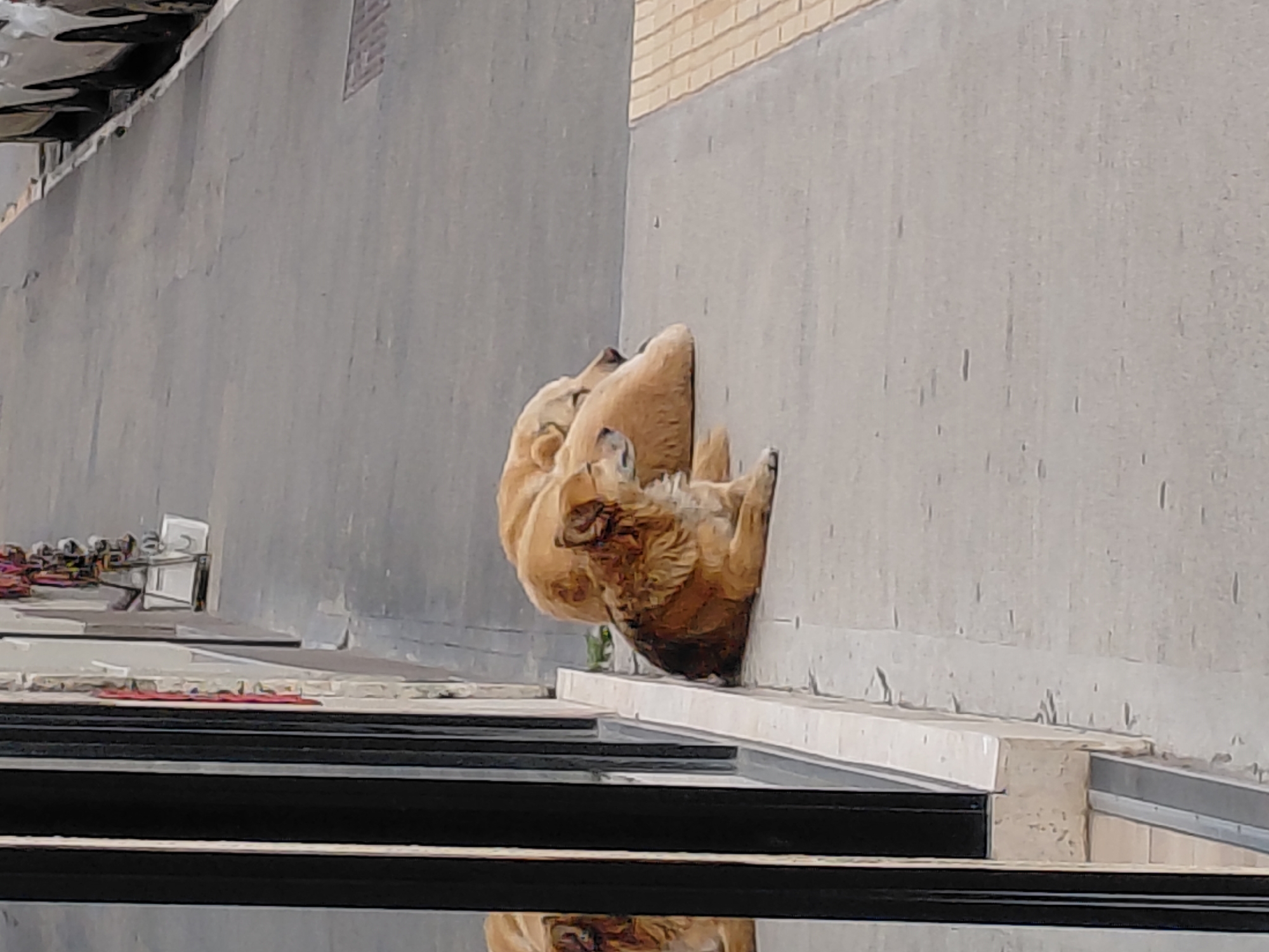 Two dogs are observed resting on a concrete sidewalk in Ushuaia, Argentina. In the foreground, a smaller, medium-brown and tan dog with shaggy fur lies prone, facing right, with its head slightly raised and gaze directed forward and slightly upward. Directly behind it, a larger, light brown or tan dog lies fully stretched out, also facing right, with its head resting on the ground, appearing to be asleep or deeply relaxed. The dogs are positioned near the base of a building facade, which features dark, reflective windows or doors on the left, mirroring portions of the scene. The sidewalk transitions to a street made of grey asphalt, where a metal grate is visible further down on the right. Along the far side of the street, several light-colored cars are parked. In the background, against a building, a bicycle rack holds multiple bicycles. A section of yellow tactile paving is present along the right edge of the sidewalk. The scene is illuminated by daylight.