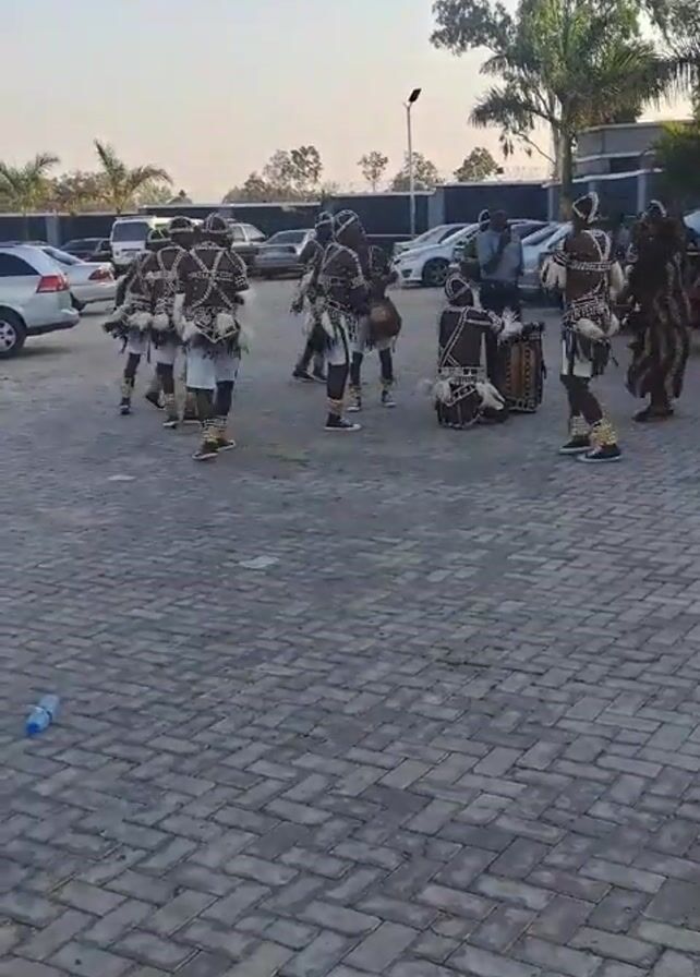 A group of around ten people are performing a traditional dance in a paved parking lot. They are dressed in black and white costumes with what appears to be decorative fur or feathers. Some are playing drums and others are dancing in a circle around them. Several cars are parked nearby, and there is a building and trees in the background. The weather appears to be clear and sunny. There is a water bottle lying on the pavement.